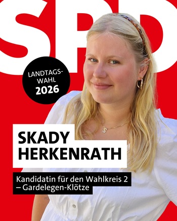 Skady Herkenrath ist unsere Landtagskandidatin im Wahlkreis 2 – Gardelegen-Klötze. Skady ist Jahre alt und Studentin. Zu ihrem Wahlkreis gehören die Hansestadt Gardelegen sowie die Städte Kalbe (Milde), Klötze und Oebisfelde-Weferlingen.